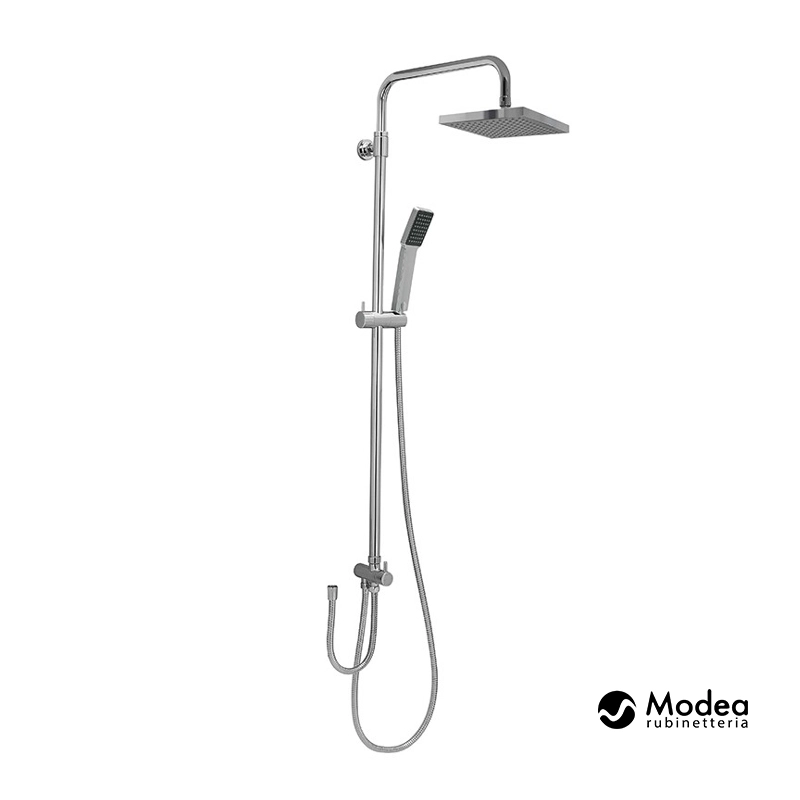 Στήλη Ντους της εταιρείας Modea ρυθμιζόμενου ύψους 100,5-134,5 cm για σύνδεση με μπαταρία λουτρού. Διαθέτει κεφαλή ντους διαστάσεων 200x200 mm με 1 μοτίβο ροής, τηλέφωνο ντους 1 λειτουργίας με διάσταση δίσκου 10 cm και σπιράλ 150 cm.