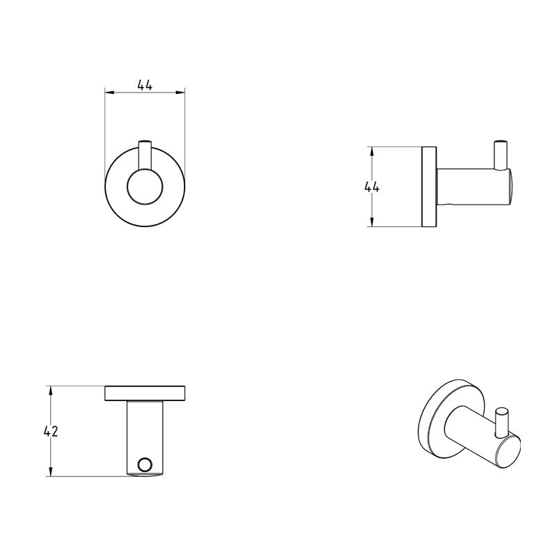 Άγκιστρο μπάνιου μονό επιτοίχιας τοποθέτησης από ορείχαλκο σε μαύρο ματ φινίρισμα. Ανήκει στην σειρά αξεσουάρ μπάνιου Sigma της ελληνικής εταιρείας Verdi. Διαστάσεις προϊόντος : 4,4 x 4,2 x 4,4 cm.