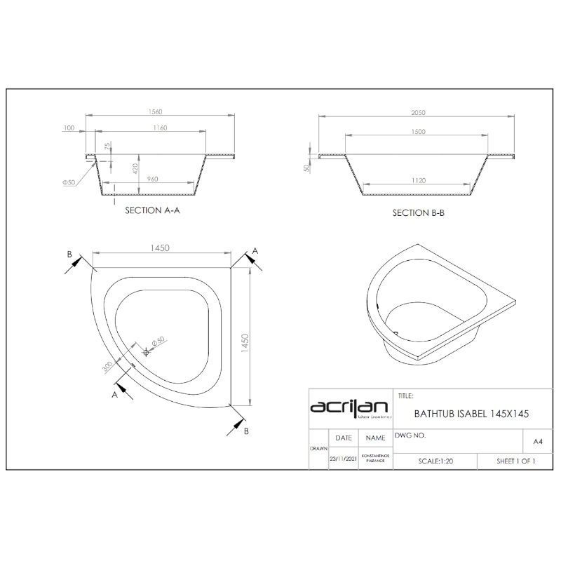 Μπανιέρα γωνιακή Isabel 1,45x1,45