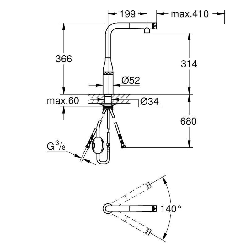 Αν θέλετε μια σύγχρονη εμφάνιση για τον πάγκο της κουζίνας σας, επιλέξτε μια μπαταρία GROHE Essence SmartControl χωρίς μοχλό, που λειτουργεί με ένα απλό κουμπί. Ο κομψός, διακριτικός σχεδιασμός προορίζεται για εγκατάσταση με μία οπή. Χάρη στο πρωτοποριακό χαρακτηριστικό SmartControl, μπορείτε να ανοίξετε και να κλείσετε τη ροή του νερού μόνο με το πάτημα ενός κουμπιού. Γυρίστε για να προσαρμόσετε τον όγκο, από τη λειτουργία εξοικόνομησης νερού eco στην πλήρη ροή. Δε χρειάζεται καν να χρησιμοποιήσετε τα χέρια σας για να το ανοίξετε - ένα πάτημα με τον καρπό ή τον αγκώνα αρκεί. Η θερμοκρασία ρυθμίζεται εύκολα μέσω της αναμικτικής βαλβίδας που βρίσκεται πάνω στο σώμα της μπαταρίας. Αυτή η μπαταρία αφήνει πολύ ελεύθερο χώρο για να γεμίζετε άνετα κατσαρόλες ή δοχεία κάτω από το υψηλό ρουξούνι σε σχήμα L. Το ρουξούνι περιστρέφεται κατά 360°, ιδανικό για μεγάλους ή διπλούς νεροχύτες. Η αποσπώμενη κεφαλή ψεκασμού με στρωτή ροή χαρίζει επιπλέον ευελιξία και μπορείτε να ξεπλένετε λαχανικά ή να κ.