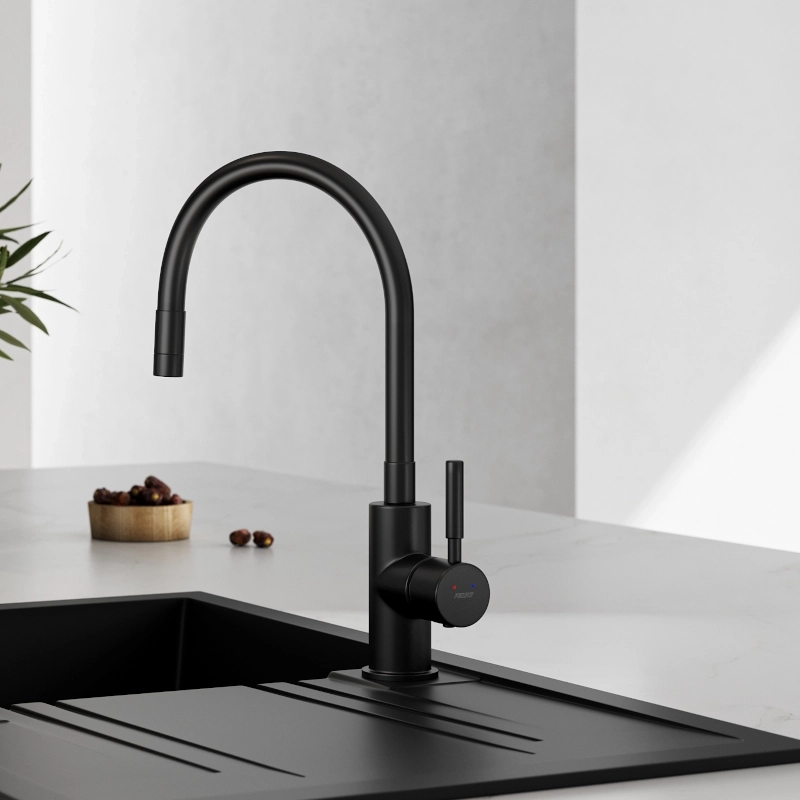 Ferro Zumba BZA4BLB - Μπαταρία κουζίνας αναμεικτική της Ferro για τοποθέτηση σε πάγκο/νεροχύτη με 1 οπή εγκατάστασης. Ο κορμός της είναι από ορείχαλκο σε μαύρο ματ φινίρισμα. Διαθέτει εύκαμπτο ρουξούνι σε μαύρο χρώμα.