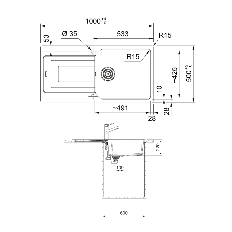 ρανιτένιος νεροχύτης Urban UBG 611-100 1000x500mm, ένθετος, αντιστρεφόμενος, coffee, με αυτόματη βαλβίδα, ελάχιστο μέγεθος ντουλαπιού 60cm.