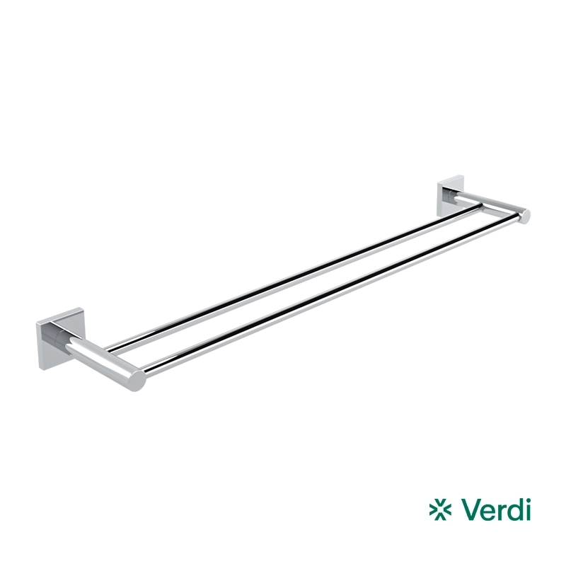 Πετσετοθήκη μπάνιου διπλή επιτοίχιας τοποθέτησης από ορείχαλκο σε χρωμέ φινίρισμα. Ανήκει στην σειρά αξεσουάρ μπάνιου Delta της ελληνικής εταιρείας Verdi. Διαστάσεις προϊόντος : 60 x 10,5 x 4 cm.