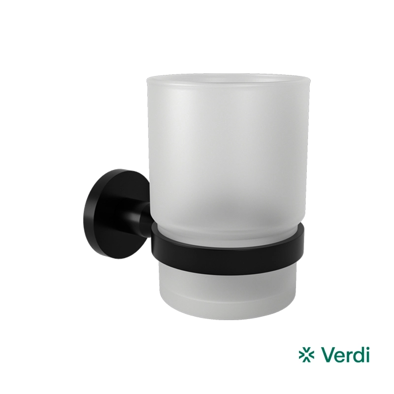 Ποτηροθήκη μπάνιου επιτοίχιας τοποθέτησης από ορείχαλκο σε μαύρο ματ φινίρισμα. Ανήκει στην σειρά αξεσουάρ μπάνιου Sigma της ελληνικής εταιρείας Verdi. Διαστάσεις προϊόντος : 7 x 10,5 x 9,5 cm.